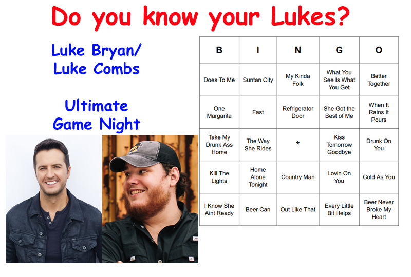 Do you know your Lukes? Songs will be from these two awesome artists! We will be playing several of our favorite games; Music Bingo, Name that Song, Trivia/Guess the lyrics. Participants will also have the chance to belt out some of their favorite Luke songs! Winners of the games will be entered into a raffle for a chance to win a prize.How exactly does it work:
