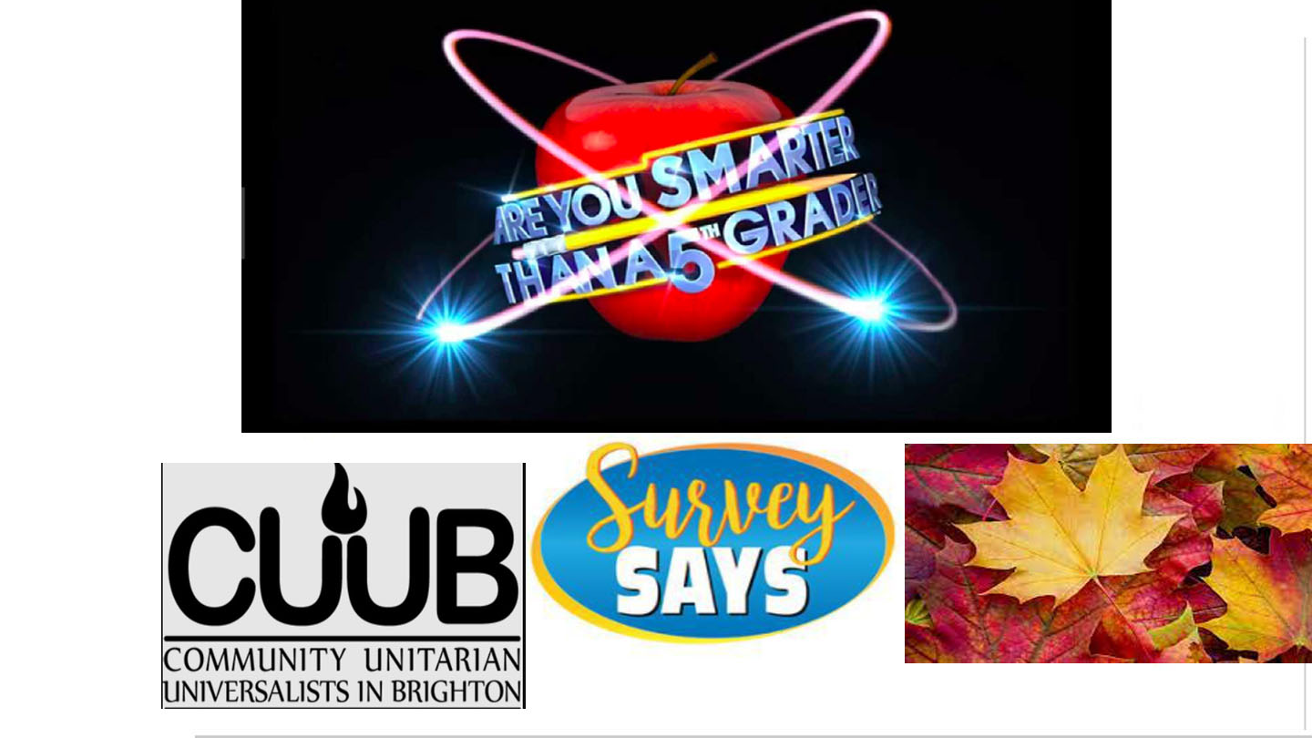 2) We will do a round of Are you smarter than a 5th grader (categories include: History, English/literature, Geography, Science, Math, Potpori), and Survey Says-- where you try to guess the top answers to survey questions (E.G. We asked 100 people, what is a cartoon character that starts with the letter M), along with a round of name that song and word bingo.