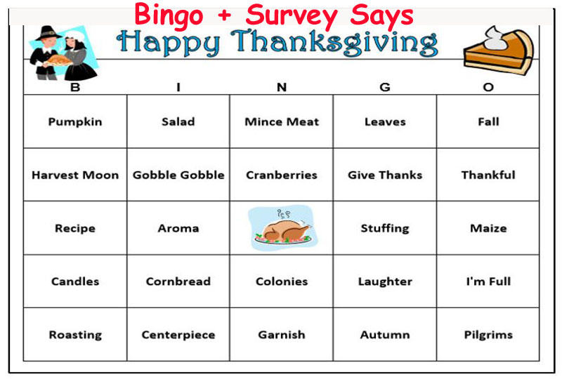 2)We will be doing a few rounds of Thanksgiving Bingo (pulling Thanksgiving words instead of bingo balls). In addition, we will do a few rounds of Survey Says, where you try to guess the top answers to survey questions related to Thanksgiving.